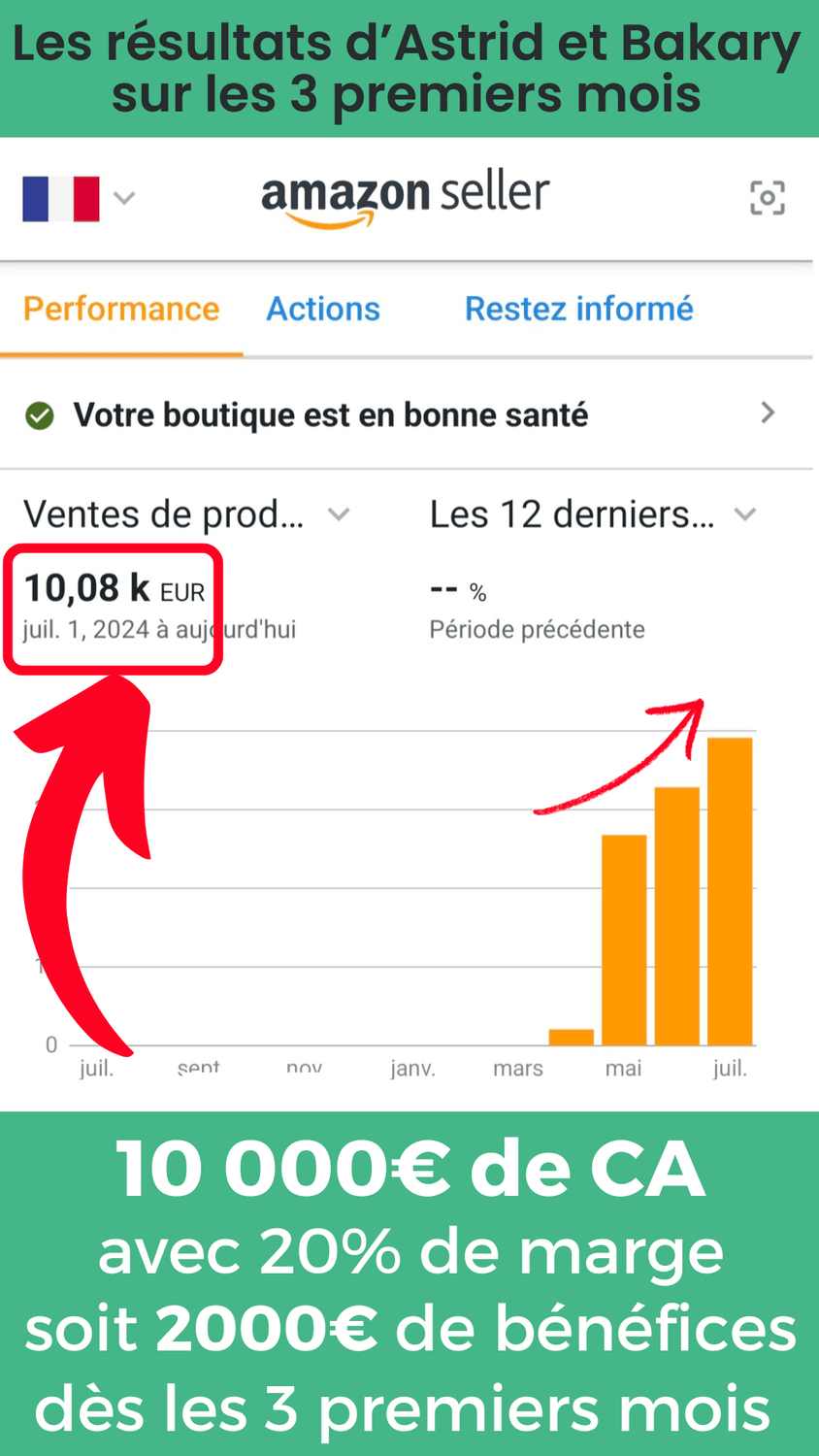 Si tu es déterminé et assidu à la mise en pratique du programme, tu pourras générer tes premières ventes dès le premier mois lorsque ton stock sera disponible dans les entrepôts Amazon.